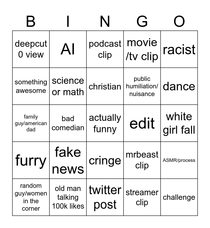 This bingo card has 45 words: brain rot, actually funny, pet video, random guy/women in the corner, food/cooking, streamer clip, podcast clip, sports, racist, old man talking 100k likes, movie /tv clip, edit, cringe, fake news, minecraft in the background., twitter post, reddit story, family guy/american dad, training, dance, AI, giveaway or sweepstakes, gaming, deepcut 0 view, inspiration core, white girl fall, haul, discipline bro, mrbeast clip, furry, millenial cringe, ASMR/process, Satisfying, fake storytime, kids/baby, bad comedian, DIY/craft, voiceover, challenge, christian, something awesome, public humiliation/ nuisance, made me say aww, science or math and teacher content.