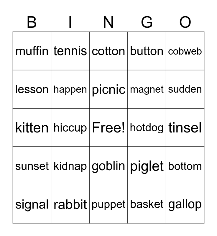 This bingo card has a free space and 24 words: kidnap, rabbit, picnic, signal, cobweb, muffin, lesson, tennis, hotdog, goblin, magnet, kitten, piglet, bottom, happen, basket, tinsel, cotton, sudden, hiccup, gallop, sunset, button and puppet.