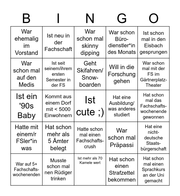This bingo card has a free space and 24 words: Hat schon mehr als 5 Ämter belegt, Musste schon mal nen Rüdiger trinken, Geht Skifahren/ Snow-boarden, War auf 5+ Fachschafts-wochenenden, Ist schon mal in den Eisbach gesprungen, War ehemalig im Vorstand, War schon mal auf den Medis, Ist neu in der Fachschaft, Hat eine Ausbildung/ was anderes studiert, Hatte schon mal einen Fachschafts-crush, Will in die Forschung gehen, Ist ein '90s Baby, War schon mal Präpassi, Hat eine nicht-deutsche Staats-bürgerschaft, Ist seit seinem/ihrem ersten Semester in der FS, Hat schon einen Strafzettel bekommen, Hat schon mal das Fachschafts-wochenende gewonnen, War schon mal skinny dipping, War schon mal mit der FS im Gärtnerplatz-Theater, Kommt aus einem Dorf mit < 5000 Einwohnern, Hat schon mal einen Sprachkurs an der Uni gemacht, Hatte mit einem/r FSler*in was, War schon Büro-dienstler*in des Monats and Ist mehr als 70 Kamele wert.