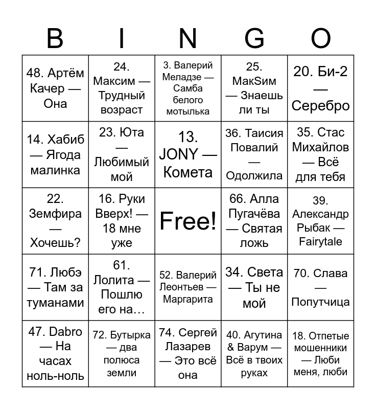This bingo card has a free space and 75 words: 1. Валерий Меладзе — Красиво, 2. Валерий Меладзе — Сэра, 3. Валерий Меладзе — Самба белого мотылька, 4. ВИА Гра — Попытка №5, 5. Алла Пугачёва — Миллион алых роз, 6. София Ротару — Лаванда, 7. Ирина Аллегрова — Императрица, 8. Лепс & Ани Лорак — Зеркала, 9. Лобода — Пуля-дура, 10. Artik & Asti — Грустный дэнс, 11. Zivert — Credo, 12. Dabro — Юность, 13. JONY — Комета, 14. Хабиб — Ягода малинка, 15. RASA — Пчеловод, 16. Руки Вверх! — 18 мне уже, 17. Иванушки International — Тополиный пух, 18. Отпетые мошенники — Люби меня, люби, 19. Мумий Тролль — Утекай, 20. Би-2 — Серебро, 21. Секрет — Привет, 22. Земфира — Хочешь?, 23. Юта — Любимый мой, 24. Максим — Трудный возраст, 25. МакSим — Знаешь ли ты, 26. Ани Лорак — Солнце, 27. Ёлка — Мир открывается, 28. Бьянка — Я не отступлю, 29. Григорий Лепс — Рюмка водки на столе, 30. Ани Лорак — Ты ещё любишь, 31. Лолита — На Титанике, 32. Верка Сердючка — Всё будет хорошо, 33. Натали — О боже, какой мужчина, 34. Света — Ты не мой, 35. Стас Михайлов — Всё для тебя, 36. Таисия Повалий — Одолжила, 37. София Ротару — Белый танец, 38. Алсу — Зимний сон, 39. Александр Рыбак — Fairytale, 40. Агутина & Варум — Всё в твоих руках, 41. Artik & Asti — Девочка, танцуй, 42. HammAli & Navai — Прятки, 43. JONY — Аллея, 44. Мари Краймбрери — Океан, 45. Niletto — Любимка, 46. Клава Кока — Покинула чат, 47. Dabro — На часах ноль-ноль, 48. Артём Качер — Она, 49. Егор Крид — Сердцеедка, 50. Лобода — SuperSTAR, 51. Владимир Пресняков — Стюардесса по имени Жанна, 52. Валерий Леонтьев — Маргарита, 53. Александр Буйнов — Актриса, 54. Михаил Шуфутинский — 3 сентября, 55. Михаил Боярский — Зелёный свет, 56. Валерий Сюткин — 7000 над землёй, 57. Игорь Николаев — Выпьем за любовь, 58. Николай Басков — Шарманка, 59. Александр Серов — Я люблю тебя до слёз, 60. Дмитрий Маликов — звезда моя далёкая, 61. Лолита — Пошлю его на…, 62. Ани Лорак — Обними меня крепче, 63. Лайма Вайкуле — Ещё не вечер, 64. Татьяна Буланова — Не плачь, 65. Наташа Королёва — Маленькая страна, 66. Алла Пугачёва — Святая ложь, 67. Валерия — Часики, 68. Елка — Прованс, 69. ВИА Гра — Перемирие, 70. Слава — Попутчица, 71. Любэ — Там за туманами, 72. Бутырка — два полюса земли, 73. Иванушки — Тучи, 74. Сергей Лазарев — Это всё она and 75. Дискотека Авария — Если хочешь остаться.
