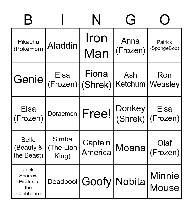 This bingo card has a free space and 50 words: Mickey Mouse, Minnie Mouse, Donald Duck, Goofy, Simba (The Lion King), Nala (The Lion King), Aladdin, Jasmine, Genie, Ariel (The Little Mermaid), Elsa (Frozen), Anna (Frozen), Olaf (Frozen), Moana, Maui (Moana), Shrek, Fiona (Shrek), Donkey (Shrek), SpongeBob, Patrick (SpongeBob), Doraemon, Nobita, Pikachu (Pokémon), Ash Ketchum, Harry Potter, Hermione Granger, Ron Weasley, Voldemort, Iron Man, Captain America, Thor, Hulk, Spider-Man, Black Panther, Deadpool, Batman, Joker, Superman, Wonder Woman, Elsa (Frozen), Buzz Lightyear (Toy Story), Woody (Toy Story), Minions, Gru (Despicable Me), Jack Sparrow (Pirates of the Caribbean), Elsa (Frozen), Maleficent, Cinderella, Belle (Beauty & the Beast) and Mulan.