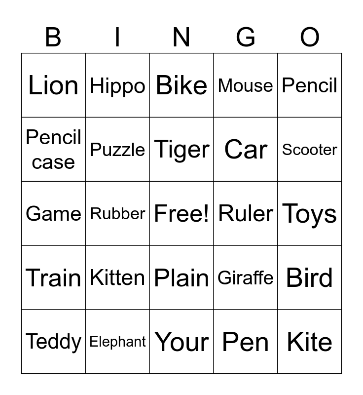 This bingo card has a free space and 29 words: Teddy, My, Rubber, Bag, Lion, Bike, Puzzle, Kitten, Ruler, Elephant, Toys, Kite, Your, Pen, Scooter, Ball, Plain, Train, Pencil, Game, Giraffe, Doll, Car, Pencil case, Mouse, Hippo, Bird, Tiger and Crocodile.