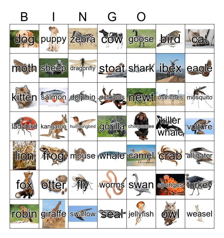 This bingo card has 95 images and 95 words: elephant, bat, fly, bee, bear, koala bear, butterfly, kitten, giraffe, shells, goldfish, cheetah, crab, cat, deer, puppy, dragonfly, worms, duck-billed platypus, sponges, weasel, fox, frog, goat, cow, goose, ostriches, eagle, hen, horse, hummingbird, whale, jellyfish, killer whale, vulture, ladybird, kangaroo, ducks, stoat, chimpanzee, ibex, mosquito, moth, sheep, mouse, octopus, tortoise, owl, pig, hippopotamus, rabbit, raccoon, gorilla, tiger, lizard, fish, robin, otter, scorpion, seal, shark, snail, snake, spider, squirrel, starfish, panda, swan, bird, turkey, lion, walrus, dolphin, wolf, camel, lobster, alligator, ant, monkey, zebra, rat, hamster, turtle, crocodile, dog, salmon, polar bears, salamander, newt, humans, chameleon, pigeon, leopard, swallow and sparrow.