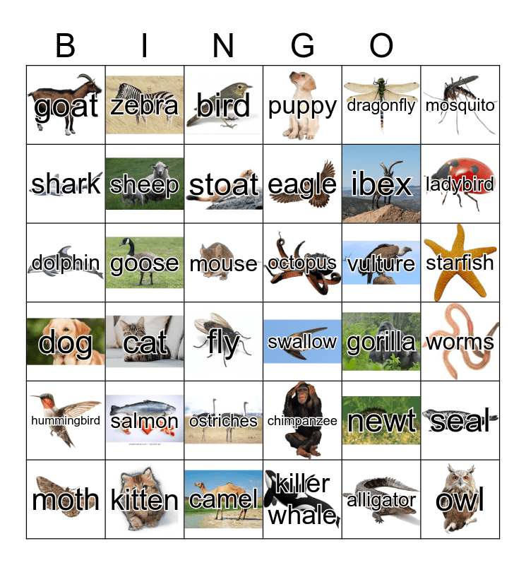 This bingo card has 95 images and 95 words: elephant, bat, fly, bee, bear, koala bear, butterfly, kitten, giraffe, shells, goldfish, cheetah, crab, cat, deer, puppy, dragonfly, worms, cow, duck-billed platypus, sponges, weasel, fox, frog, goat, goose, ostriches, eagle, hen, horse, hummingbird, whale, jellyfish, killer whale, vulture, ladybird, kangaroo, ducks, stoat, chimpanzee, ibex, mosquito, moth, sheep, mouse, octopus, tortoise, owl, pig, hippopotamus, rabbit, raccoon, gorilla, tiger, lizard, fish, robin, otter, scorpion, seal, shark, snail, snake, spider, squirrel, starfish, panda, swan, bird, turkey, lion, walrus, dolphin, wolf, camel, lobster, alligator, ant, monkey, zebra, rat, hamster, turtle, crocodile, dog, salmon, polar bears, salamander, newt, humans, chameleon, pigeon, leopard, swallow and sparrow.
