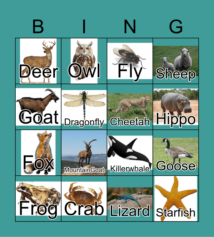 This bingo card has 82 images and 82 words: Elephant, Bat, Fly, Bee, Bear, Koalabear, Butterfly, Kitten, Cow, Giraffe, Shells, Goldfish, Cheetah, Crab, Cat, Deer, Puppy, Dragonfly, Worms, Platypus, Moose, Fox, Frog, Goat, Goose, Ostriches, Eagle, Chicken, Horse, Hummingbird, Whale, Jellyfish, Killerwhale, Vulture, Ladybug, Kangaroo, Ducks, Monkey, MountainGoat, Mosquito, Moth, Sheep, Mouse, Octopus, Turtle, Owl, Pig, Hippo, Rabbit, Raccoon, Tiger, Lizard, Fish, Rooster, Beaver, Scorpion, Seal, Shark, Snail, Snake, Spider, Squirrel, Starfish, Panda, Swan, Bird, Turkey, Lion, Walrus, Dolphin, Wolf, Camel, Lobster, Alligator, Ant, Zebra, Rat, Hamster, Dog, PolarBears, People and Pigeon.