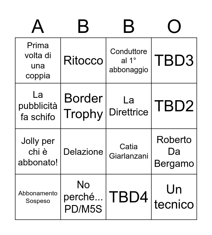 This bingo card has 20 words: Roberto Da Bergamo, Tony Gorgonzola, Conduttore al 1° abbonaggio, Abbonamento 1€ Giorno, Abbonamento Sospeso, La pubblicità fa schifo, No perché... PD/M5S, Prima volta di una coppia, Jolly per chi è abbonato!, Ritocco, Delazione, Catia Giarlanzani, Border Trophy, Un tecnico, La Direttrice, TBD1, TBD2, TBD3, TBD4 and TBD5.