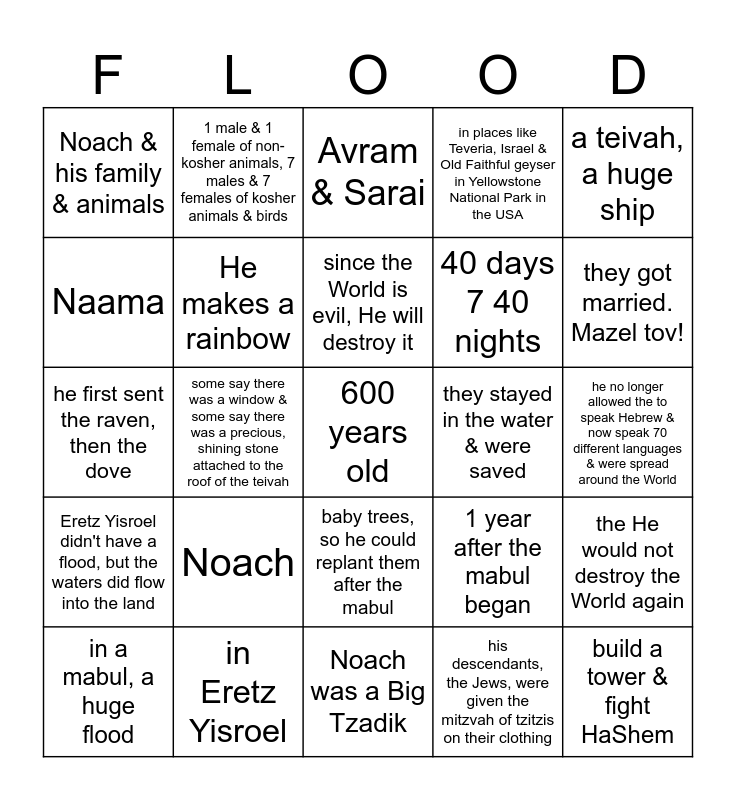 This bingo card has 25 words: Noach, Noach was a Big Tzadik, since the World is evil, He will destroy it, in a mabul, a huge flood, a teivah, a huge ship, Noach & his family & animals, Naama, 1 male & 1 female of non-kosher animals, 7 males & 7 females of kosher animals & birds, they stayed in the water & were saved, baby trees, so he could replant them after the mabul, 40 days 7 40 nights, he first sent the raven, then the dove, 1 year after the mabul began, the He would not destroy the World again, He makes a rainbow, build a tower & fight HaShem, he no longer allowed the to speak Hebrew & now speak 70 different languages & were spread around the World, Avram & Sarai, they got married. Mazel tov!, some say there was a window & some say there was a precious, shining stone attached to the roof of the teivah, 600 years old, in Eretz Yisroel, Eretz Yisroel didn't have a flood, but the waters did flow into the land, in places like Teveria, Israel & Old Faithful geyser in Yellowstone National Park in the USA and his descendants, the Jews, were given the mitzvah of tzitzis on their clothing.