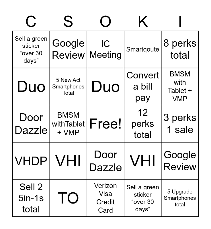 This bingo card has a free space and 24 words: Sell 2 5in-1s total, VHI, Duo, Sell a green sticker “over 30 days”, 8 perks total, Sell a green sticker “over 30 days”, Google Review, IC Meeting, 12 perks total, 3 perks 1 sale, Door Dazzle, 5 New Act Smartphones Total, VHI, Google Review, Duo, TO, Verizon Visa Credit Card, Smartqoute, BMSM with Tablet + VMP, VHDP, BMSM withTablet + VMP, Door Dazzle, Convert a bill pay and 5 Upgrade Smartphones total.