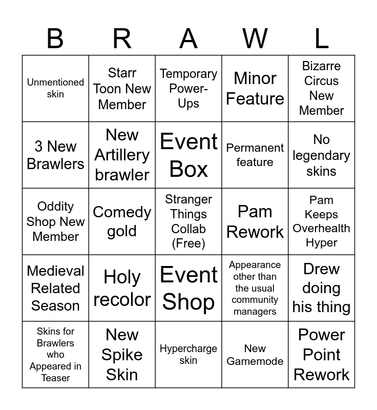 This bingo card has a free space and 24 words: Holy recolor, New Spike Skin, Event Box, Skins for Brawlers who Appeared in Teaser, Bizarre Circus New Member, Unmentioned skin, 3 New Brawlers, Starr Toon New Member, Pam Rework, Event Shop, Permanent feature, Oddity Shop New Member, Appearance other than the usual community managers, Drew doing his thing, New Artillery brawler, New Gamemode, Pam Keeps Overhealth Hyper, Temporary Power-Ups, No legendary skins, Comedy gold, Power Point Rework, Medieval Related Season, Minor Feature and Hypercharge skin.