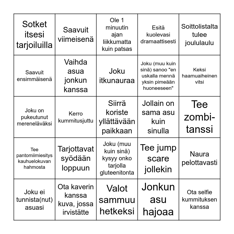 This bingo card has 25 words: Tarjottavat syödään loppuun, Valot sammuu hetkeksi, Joku itkunauraa, Joku ei tunnista(nut) asuasi, Soittolistalta tulee joululaulu, Sotket itsesi tarjoiluilla, Saavuit ensimmäisenä, Saavuit viimeisenä, Jollain on sama asu kuin sinulla, Joku (muu kuin sinä) kysyy onko tarjolla gluteenitonta, Joku (muu kuin sinä) sanoo "en uskalla mennä yksin pimeään huoneeseen", Joku on pukeutunut mereneläväksi, Tee jump scare jollekin, Naura pelottavasti, Vaihda asua jonkun kanssa, Ota selfie kummituksen kanssa, Tee zombi-tanssi, Ole 1 minuutin ajan liikkumatta kuin patsas, Keksi haamuaiheinen vitsi, Kerro kummitusjuttu, Siirrä koriste yllättävään paikkaan, Ota kaverin kanssa kuva, jossa irvistätte, Tee pantomiimiesitys kauhuelokuvan hahmosta, Esitä kuolevasi dramaattisesti and Jonkun asu hajoaa.