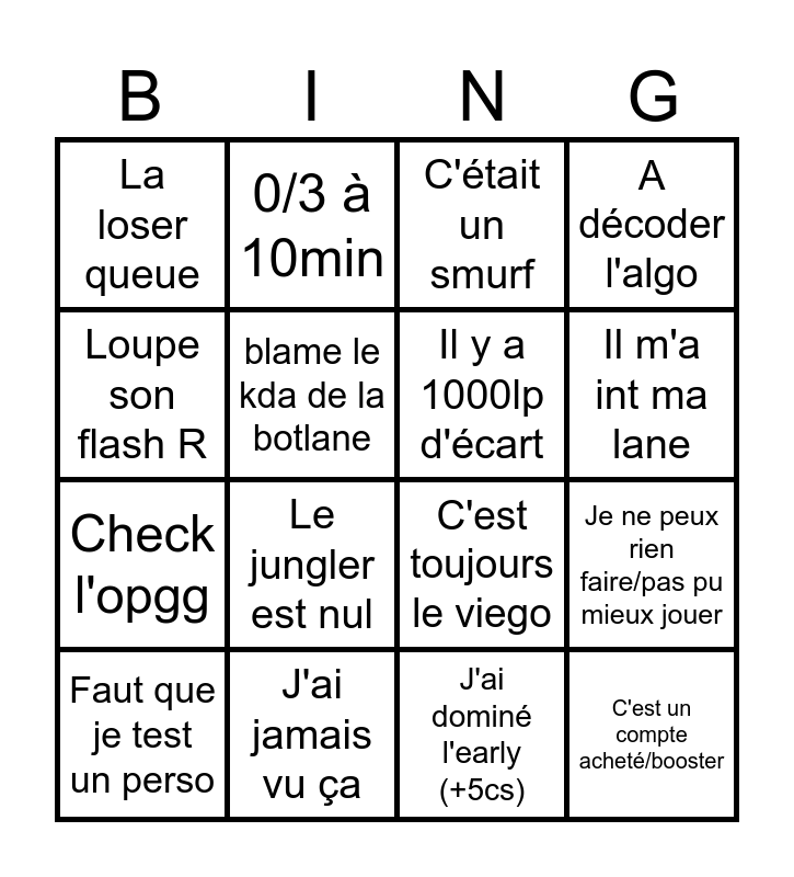 This bingo card has 16 words: J'ai jamais vu ça, Je ne peux rien faire/pas pu mieux jouer, C'était un smurf, La loser queue, Check l'opgg, 0/3 à 10min, C'est toujours le viego, J'ai dominé l'early (+5cs), Loupe son flash R, blame le kda de la botlane, Faut que je test un perso, A décoder l'algo, Le jungler est nul, Il m'a int ma lane, Il y a 1000lp d'écart and C'est un compte acheté/booster.