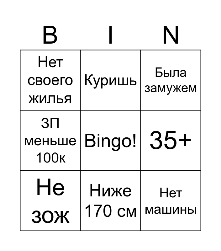 This bingo card has a free space and 8 words: 35+, Была замужем, Куришь, Не зож, Нет своего жилья, Нет машины, ЗП меньше 100к and Ниже 170 см.