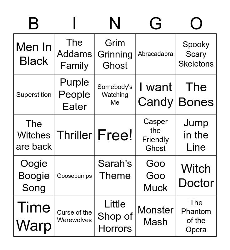This bingo card has a free space and 32 words: Monster Mash, Ghostbusters, Thriller, This is Halloween, Oogie Boogie Song, Purple People Eater, Spooky Scary Skeletons, Witch Doctor, The Addams Family, I Put a Spell on You, Somebody's Watching Me, Grim Grinning Ghost, Scooby Doo, Boo for You Halloween, Casper the Friendly Ghost, I'm in Love with a Monster, Time Warp, The Witches are back, Sarah's Theme, Goosebumps, Goo Goo Muck, Sandman, Jump in the Line, Curse of the Werewolves, The Phantom of the Opera, Abracadabra, I want Candy, Superstition, Men In Black, Little Shop of Horrors, Witchy Woman and The Bones.