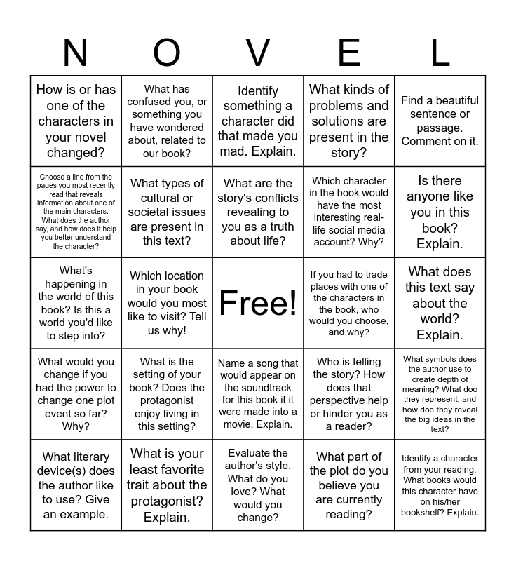 This bingo card has a free space and 24 words: What is the setting of your book? Does the protagonist enjoy living in this setting?, What is your least favorite trait about the protagonist? Explain., What are the story's conflicts revealing to you as a truth about life?, What literary device(s) does the author like to use? Give an example., Find a beautiful sentence or passage. Comment on it., How is or has one of the characters in your novel changed?, Choose a line from the pages you most recently read that reveals information about one of the main characters. What does the author say, and how does it help you better understand the character?, What has confused you, or something you have wondered about, related to our book?, If you had to trade places with one of the characters in the book, who would you choose, and why?, Name a song that would appear on the soundtrack for this book if it were made into a movie. Explain., Which character in the book would have the most interesting real-life social media account? Why?, What's happening in the world of this book? Is this a world you'd like to step into?, Who is telling the story? How does that perspective help or hinder you as a reader?, What symbols does the author use to create depth of meaning? What doo they represent, and how doe they reveal the big ideas in the text?, What types of cultural or societal issues are present in this text?, What part of the plot do you believe you are currently reading?, What does this text say about the world? Explain., Identify something a character did that made you mad. Explain., Is there anyone like you in this book? Explain., Which location in your book would you most like to visit? Tell us why!, Identify a character from your reading. What books would this character have on his/her bookshelf? Explain., What would you change if you had the power to change one plot event so far? Why?, What kinds of problems and solutions are present in the story? and Evaluate the author's style. What do you love? What would you change?.