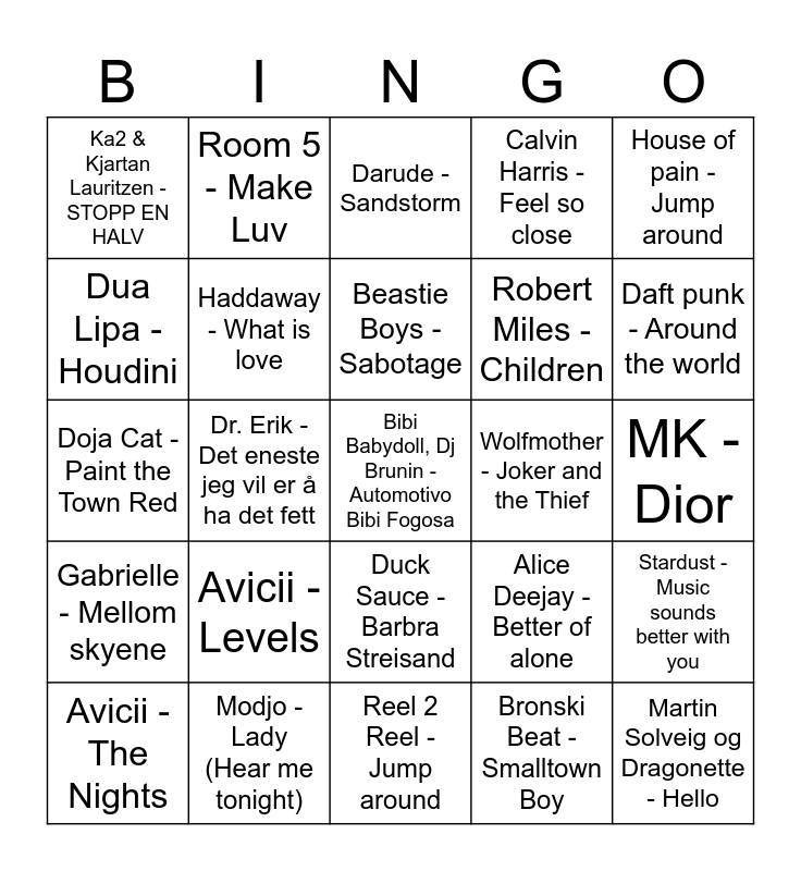 This bingo card has 25 words: Avicii - Levels, Reel 2 Reel - Jump around, Beastie Boys - Sabotage, Avicii - The Nights, House of pain - Jump around, Ka2 & Kjartan Lauritzen - STOPP EN HALV, Dua Lipa - Houdini, Room 5 - Make Luv, Wolfmother - Joker and the Thief, Duck Sauce - Barbra Streisand, Robert Miles - Children, Doja Cat - Paint the Town Red, Alice Deejay - Better of alone, Stardust - Music sounds better with you, Haddaway - What is love, Martin Solveig og Dragonette - Hello, MK - Dior, Darude - Sandstorm, Daft punk - Around the world, Dr. Erik - Det eneste jeg vil er å ha det fett, Bibi Babydoll, Dj Brunin - Automotivo Bibi Fogosa, Modjo - Lady (Hear me tonight), Gabrielle - Mellom skyene, Calvin Harris - Feel so close and Bronski Beat - Smalltown Boy.