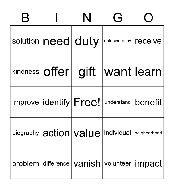 This bingo card has a free space and 24 words: action, difference, gift, problem, receive, solution, kindness, need, understand, value, want, improve, individual, neighborhood, offer, volunteer, benefit, duty, learn, identify, impact, biography, autobiography and vanish.