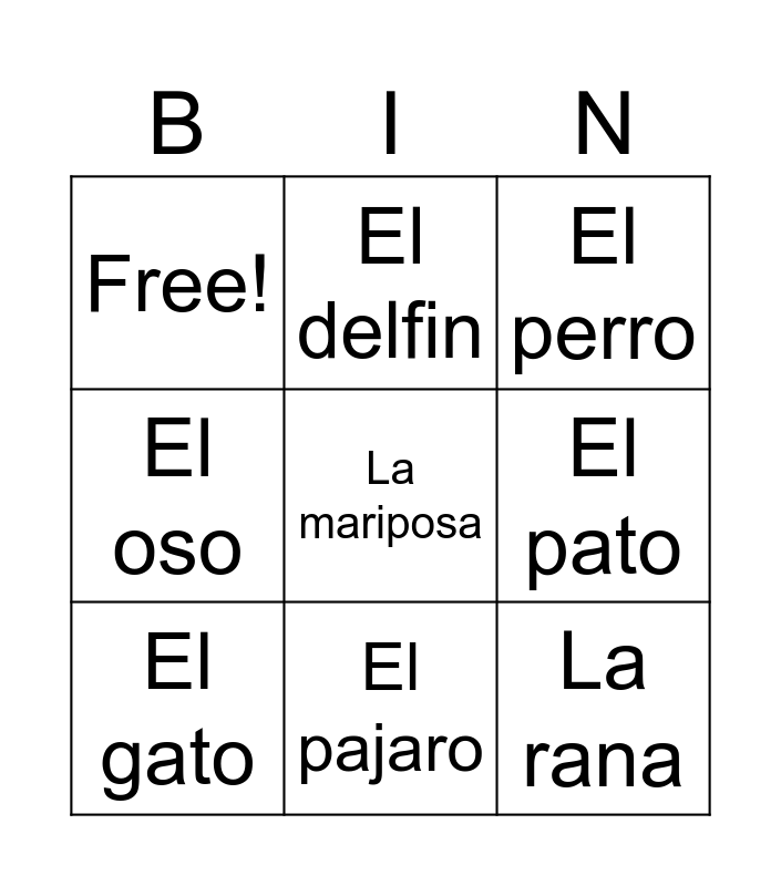This bingo card has 9 words: El gato, El perro, El delfin, El oso, Free!, El pato, La mariposa, La rana and El pajaro.