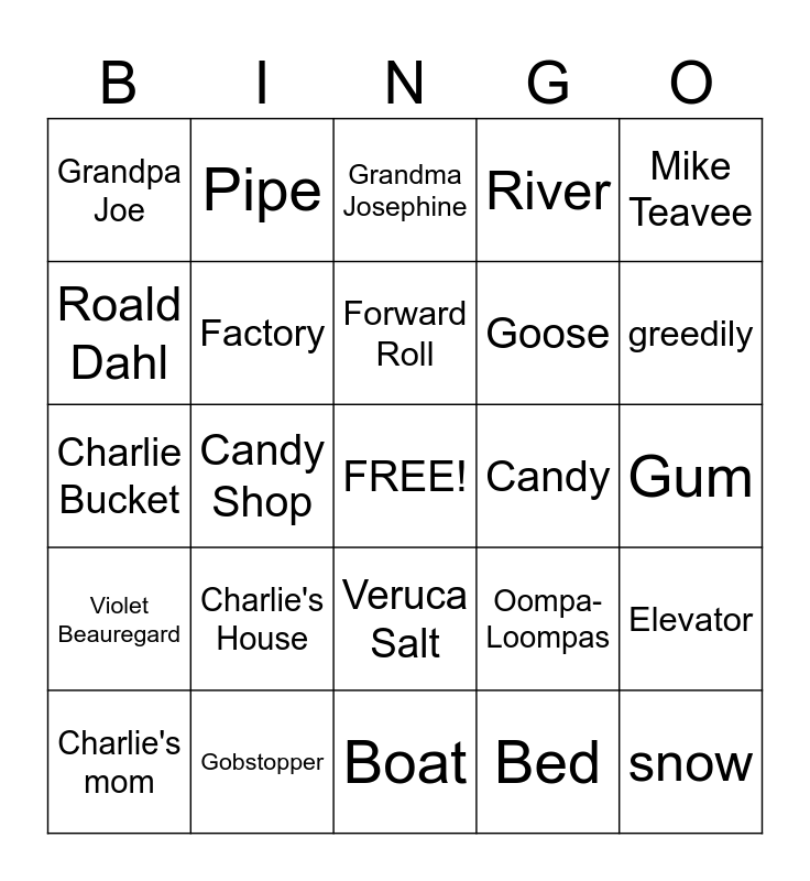This bingo card has a free space and 29 words: Charlie's mom, Wonka Bar, Candy Shop, Charlie's dad, Grandpa Joe, Grandma Josephine, Factory, Charlie's House, Candy, Gobstopper, Gum, snow, Boat, Bed, greedily, Augustus Gloop, Veruca Salt, Violet Beauregard, Mike Teavee, Charlie Bucket, Oompa-Loompas, Mr. Wonka, Goose, Roald Dahl, River, Pipe, Elevator, Forward Roll and Cane.