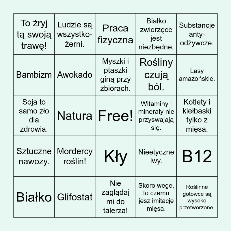 This bingo card has a free space and 24 words: Mordercy roślin!, Glifostat, Myszki i ptaszki giną przy zbiorach., Białko, Substancje anty-odżywcze., To żryj tą swoją trawę!, Bambizm, Ludzie są wszystko-żerni., Witaminy i minerały nie przyswajają się., Kły, Rośliny czują ból., Soja to samo zło dla zdrowia., Nieetyczne lwy., B12, Awokado, Skoro wege, to czemu jesz imitacje mięsa., Kotlety i kiełbaski tylko z mięsa., Praca fizyczna, Lasy amazońskie., Natura, Roślinne gotowce są wysoko przetworzone., Sztuczne nawozy., Białko zwierzęce jest niezbędne. and Nie zaglądaj mi do talerza!.