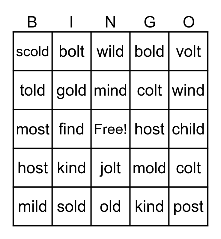 This bingo card has a free space and 29 words: mild, fold, find, grind, scold, wild, gold, kind, host, sold, child, post, old, kind, wind, fold, jolt, host, volt, most, mold, blind, colt, told, bold, bolt, colt, mind and hold.