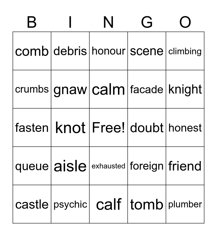 This bingo card has a free space and 25 words: aisle, calf, calm, castle, climbing, comb, crumbs, debris, doubt, exhausted, facade, fasten, foreign, friend, gnaw, heir, honest, honour, knight, knot, plumber, psychic, queue, scene and tomb.