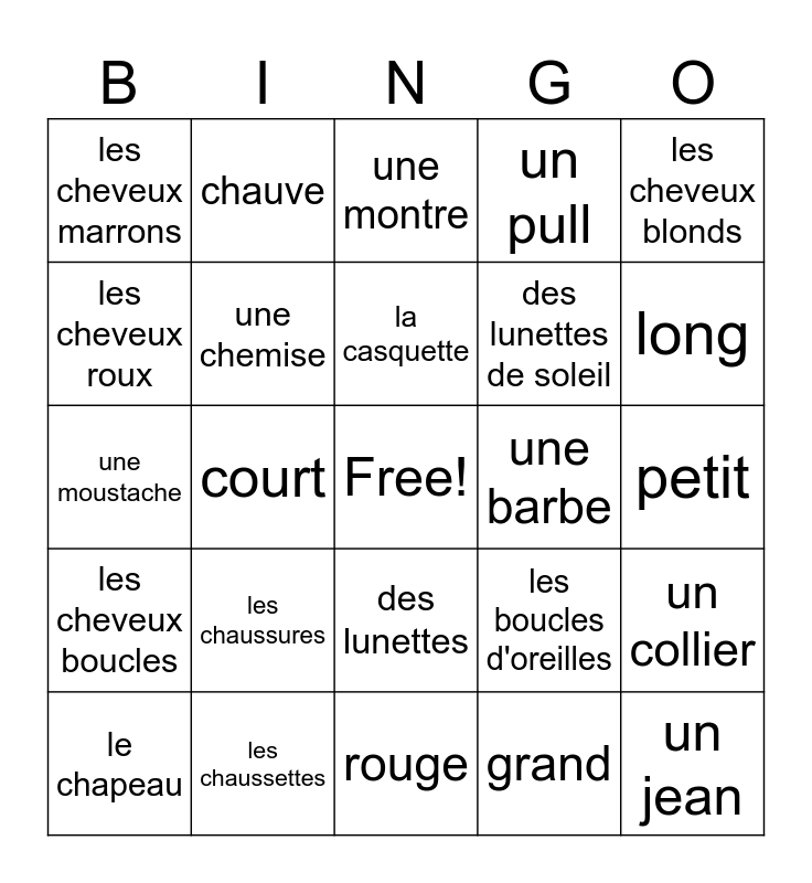 This bingo card has a free space and 24 words: les chaussures, les chaussettes, la casquette, le chapeau, les cheveux blonds, les cheveux marrons, les cheveux roux, chauve, une barbe, des lunettes, des lunettes de soleil, une moustache, les boucles d'oreilles, un collier, une chemise, grand, petit, une montre, long, court, un jean, les cheveux boucles, un pull and rouge.