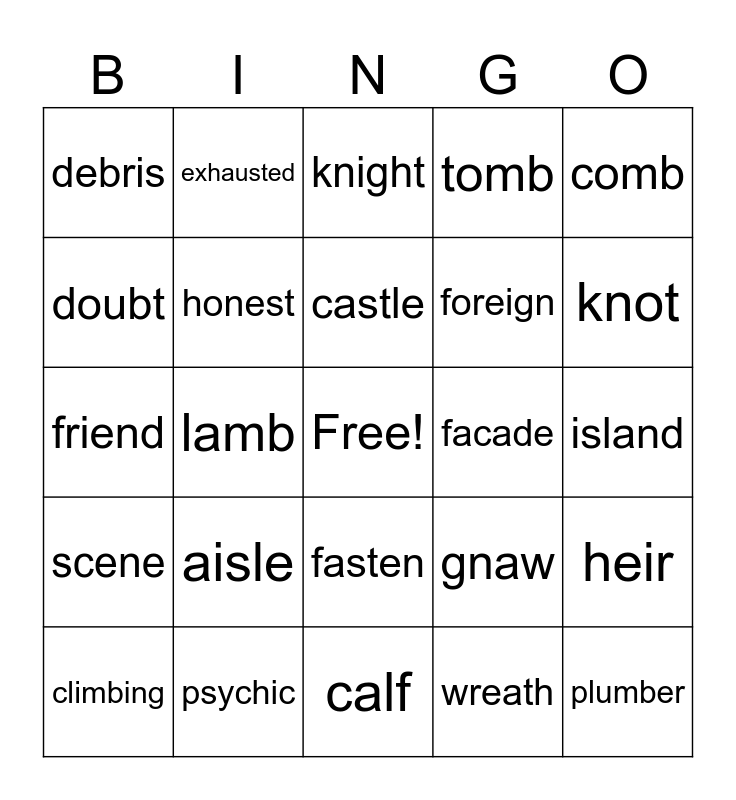 This bingo card has a free space and 25 words: aisle, calf, castle, climbing, comb, debris, doubt, exhausted, facade, fasten, foreign, friend, gnaw, heir, honest, honour, island, knight, knot, lamb, plumber, psychic, scene, tomb and wreath.