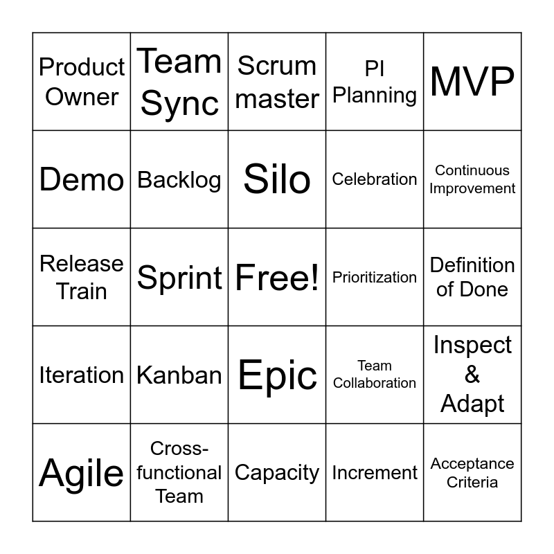 This bingo card has a free space and 29 words: Agile, Scrum, Sprint, User Story, Product Owner, Scrum master, Backlog, Kanban, Prioritization, Cross-functional Team, Definition of Done, Acceptance Criteria, Capacity, Increment, Continuous Improvement, Retrospective, Epic, Iteration, MVP, Release Train, Team Collaboration, Story Points, Celebration, Demo, PI Planning, Team Sync, Inspect & Adapt, Silo and Growth Mindset.