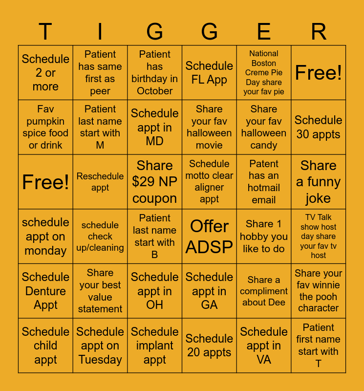 This bingo card has 36 words: Schedule appt in GA, Schedule appt in OH, Schedule 20 appts, Fav pumpkin spice food or drink, schedule appt on monday, Schedule motto clear aligner appt, Patient last name start with M, Schedule implant appt, National Boston Creme Pie Day share your fav pie, Share a compliment about Dee, Schedule 30 appts, Schedule FL App, Share your fav winnie the pooh character, Reschedule appt, Share your fav halloween movie, Schedule 2 or more, Schedule Denture Appt, Patent has an hotmail email, Free!, Patient has birthday in October, Share $29 NP coupon, schedule check up/cleaning, Offer ADSP, Patient last name start with B, Share 1 hobby you like to do, Patient has same first as peer, Share your fav halloween candy, Schedule appt on Tuesday, Schedule appt in MD, Free!, Patient first name start with T, Schedule child appt, TV Talk show host day share your fav tv host, Share a funny joke, Share your best value statement and Schedule appt in VA.