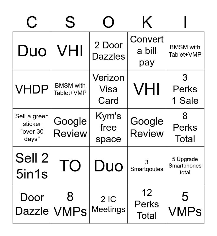 This bingo card has a free space and 24 words: Door Dazzle, TO, Verizon Visa Card, 12 Perks Total, BMSM with Tablet+VMP, Duo, VHI, 2 Door Dazzles, Google Review, 8 Perks Total, Sell a green sticker "over 30 days", BMSM with Tablet+VMP, 3 Smartqoutes, 5 Upgrade Smartphones total, VHDP, 8 VMPs, 2 IC Meetings, Convert a bill pay, 3 Perks 1 Sale, Sell 2 5in1s, Google Review, Duo, VHI and 5 VMPs.