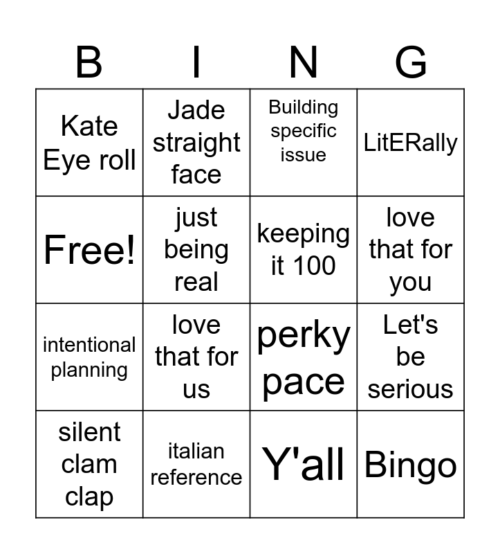 This bingo card has 16 words: italian reference, Let's be serious, Building specific issue, Kate Eye roll, intentional planning, Jade straight face, perky pace, Y'all, Free!, just being real, silent clam clap, LitERally, love that for us, love that for you, keeping it 100 and Bingo.