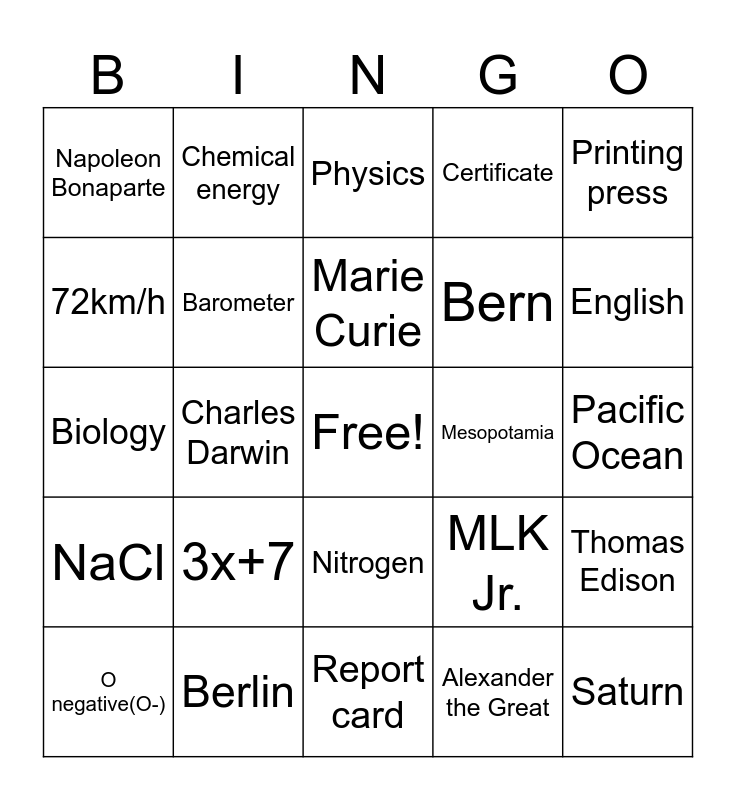 This bingo card has a free space and 100 words: Asia, Nile River, Pacific Ocean, Sahara Desert, Everest, Equator, Outer Core, Mountain Range, Erosion, The crust, Russia, India, Japan, Berlin, Canberra, Ankara, Bern, Rome, Venice, Moscow, Ferdinand Magellan, The Renaissance, The Inca Empire, Hieroglyphics, Ancient Greece, Mesopotamia, Printing press, MLK Jr., Wright, Nelson Mandela, Charles Darwin, Napoleon Bonaparte, Genghis Khan, Winston Churchill, Alexander the Great, Marie Curie, Thomas Edison, Tun Hussein Onn, Portugal, 16 September, Practice, Mathematics, Biology, Geography, English, Physics, ICT, Remember lessons, Library, Report card, Civics, Test, Ceremony, Discipline, Chemistry, Collaborate, Communication, Monitor, Vacation, Certificate, 50, 12, 3, 24cm, 216, 8, 20 cm², 0.6, 7cm, 125 cm³, RM 14, 3x+7, ¼, 45km/h, 15 apples, Pythagoras Theorem, 549 minutes, 72km/h, 540, 9, Au, Saturn, Nucleus, Nitrogen, To carry oxygen, Chemical energy, Uranus, Earthquakes, The moon's gravity, NaCl, Vitamin D, Cerebellum, Igneous rock, O negative(O-), Barometer, Carbon dioxide, Oxygen, 46, Pupil and Jupiter.