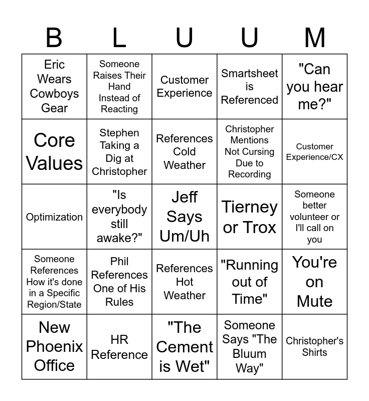This bingo card has a free space and 28 words: You're on Mute, Someone Curses, Christopher Mentions Not Cursing Due to Recording, Someone Says "The Bluum Way", Core Values, Customer Experience, Someone Raises Their Hand Instead of Reacting, Someone References How it's done in a Specific Region/State, Tierney or Trox, New Phoenix Office, Optimization, Smartsheet is Referenced, HR Reference, "The Cement is Wet", Customer Experience/CX, "K20", Phil References One of His Rules, Stephen Taking a Dig at Christopher, References Cold Weather, References Hot Weather, Eric Wears Cowboys Gear, Phil's Mustache, Christopher's Shirts, "Is everybody still awake?", Someone better volunteer or I'll call on you, "Running out of Time", "Can you hear me?" and "Can you see my screen?".