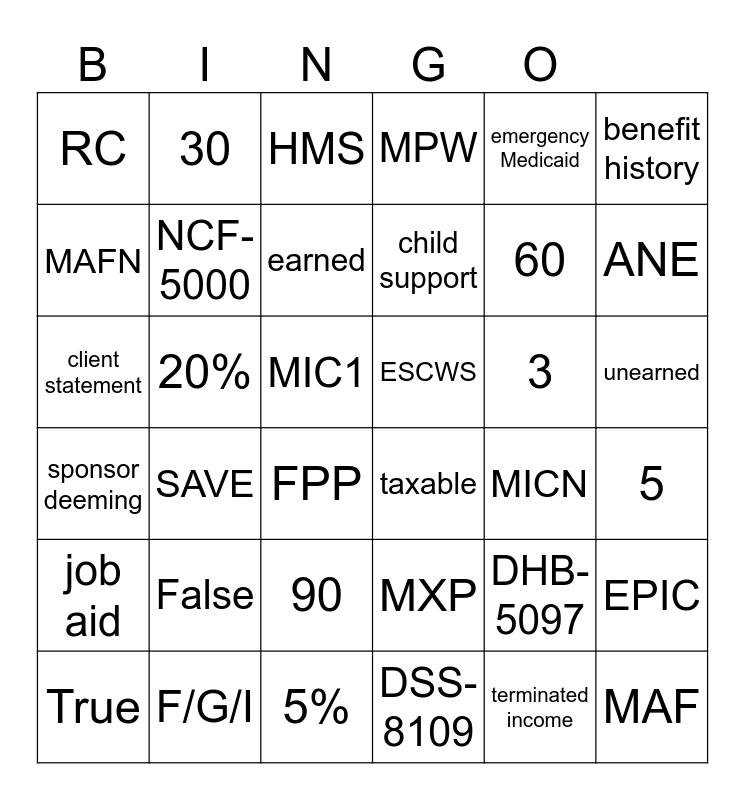 This bingo card has 36 words: MXP, 90, DSS-8109, MAFN, sponsor deeming, ESCWS, NCF-5000, 5%, emergency Medicaid, DHB-5097, ANE, MPW, EPIC, 20%, child support, RC, job aid, 3, client statement, HMS, MIC1, SAVE, taxable, FPP, MICN, 30, 60, F/G/I, earned, benefit history, MAF, True, 5, unearned, False and terminated income.