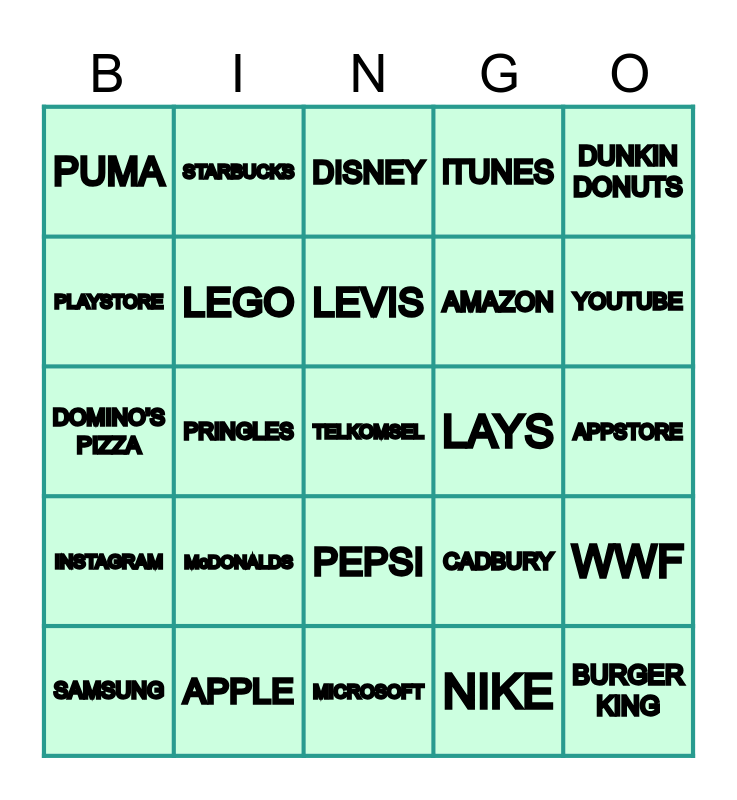 This bingo card has 36 words: UNILEVER, NESTLE, PLAYSTORE, LEGO, CADBURY, INSTAGRAM, LEVIS, WALLS, DUNKIN DONUTS, TIK-TOK, PRINGLES, iTUNES, MASTERCARD, LAYS, YOUTUBE, PUMA, BURGER KING, McDONALDS, TELKOMSEL, DISNEY, APPSTORE, WWF, APPLE, SAMSUNG, MICROSOFT, STARBUCKS, DOMINO'S PIZZA, VODAFONE, AMAZON, PLAYSTORE, MIXUE, TWITTER, NIKE, PEPSI, KFC and PIZZA HUT.