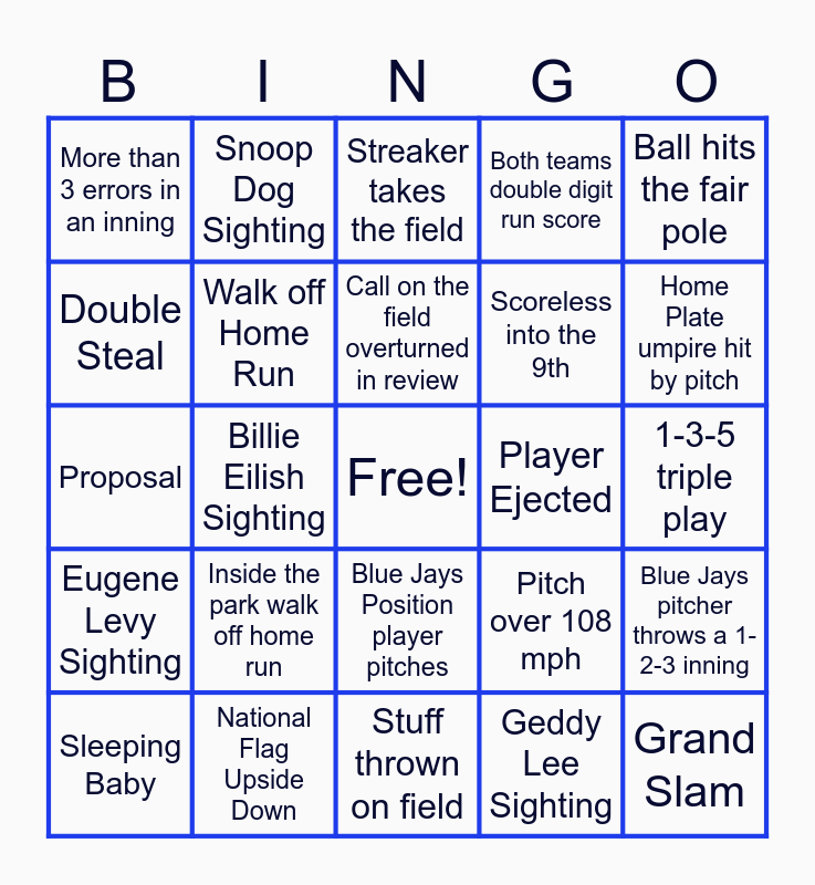 This bingo card has a free space and 59 words: Triple Play, National Flag Upside Down, Mention of Dodgers Payroll, Eugene Levy Sighting, Geddy Lee Sighting, Starting pitcher pulled in the first inning, Walk off Home Run, Extra Innings, Scoreless into the 9th, Scoreless into the 7th, Both teams double digit run score, More than 6 runs in an inning, Double Steal, Steal Home, Stand up Triple (no error), More than 3 errors in an inning, Grand Slam, Ball hits the fair pole, Bunt for a hit (no runners on), Call on the field overturned in review, Player Ejected, Streaker takes the field, Sleeping Baby, Blue Jays pitcher throws a 1-2-3 inning, Delay of Game, Roof is open, No hitter, Player Catches in the Crowd, Home Plate umpire hit by pitch, Blue Jays Bat Around, Dodgers Bat Around, President at Game, Vice President at Game, Premier at Game, Snoop Dog Sighting, Home Plate Lady Sighting, Magic Johnson Sighting, Billie Eilish Sighting, Sign spelled wrong, Proposal, Unassisted Triple Play, Inside the park walk off home run, 1-3-5 triple play, Fan Interference in Play, Home run first pitch, Ohtani HR and strike out three players in the same inning, All three Dodgers Japanese pitchers pitch in the same game, Dodgers Position Player pitches (ohtani excepted), Blue Jays Position player pitches, Stuff thrown on field, Disruptive Fans - fight or removal, It's my birthday sign, Will you marry me sign, Animal interruption, 9 pitch inning, Pitch over 108 mph, Run scored off a wild pitch, Player steals second, third and home in a single inning and Announcer says "never in my life".