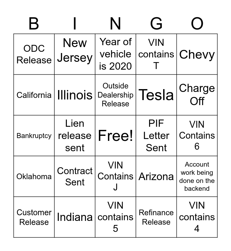 This bingo card has a free space and 34 words: Total Loss, Refinance Release, Nissan, Year of vehicle is 2019, Oklahoma, Illinois, Chevy, Customer Release, New Jersey, Year of vehicle is 2022, Outside Dealership Release, Year of vehicle is 2020, Ohio, Ford, PIF Letter Sent, Charge Off, Indiana, Bankruptcy, Contract Sent, Arizona, VIN Contains J, SIF Letter Sent, ODC Release, VIN Contains 6, VIN contains 5, VIN contains 4, VIN contains T, Mazda, Tesla, California, Kentucy, Lien release sent, Account work being done on the backend and NSF greater than $1k.