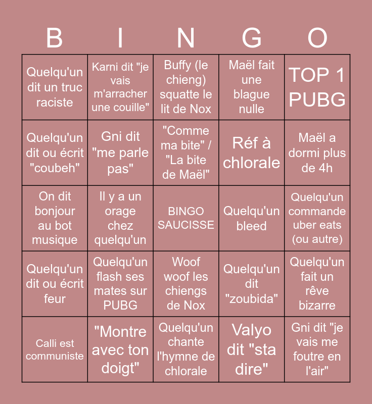 This bingo card has a free space and 64 words: Quelqu'un dit ou écrit "quette", Quelqu'un est abandonné dans PUBG, Alice écoute pas, Quelqu'un fait un rêve bizarre, Le capitaine vient jouer à PUBG, Gni fait une réf à un truc bre-som sur youtube, Karni dit "je vais m'arracher une couille", On entend la fourchette de Gni, "Comme ma bite" / "La bite de Maël", Mega cite une vieille expression, Woof woof les chiengs de Nox, Ça parle des gauchiasses, Quelqu'un commande uber eats (ou autre), TOP 1 PUBG, Quelqu'un fait une blague sur le CUL, Quelqu'un dit ou écrit "coubeh", Il y a un orage chez quelqu'un, Quelqu'un dit un truc raciste, "Constat à l'amiable" / "Préjudice moral", Réf à chlorale, Quelqu'un flash ses mates sur PUBG, Quelqu'un dit ou écrit feur, Maël fait une blague nulle, Mega dit "terrible", Quelqu'un se fait mute, Karni fait une blague limite, Quelqu'un chante skibidi, Quelqu'un se plaint de Céleste / la mairie, On entend Gni qui boit de l'eau, Ça joue à Minecraft, Ça parle de la droite, On met une phrase dans out of context, Zeks dit "HEEEEEE", "/me j'ouvre un ticket", Maël a dormi plus de 4h, Calli est communiste, Alice vient en voc en étant dans son lit, Valyo dit "sta dire", On regarde un film, Gni dit "me parle pas", On dit bonjour au bot musique, Quelqu'un bleed, Quelqu'un trash les NB, Zeks fait la promo de la bretagne, Quelqu'un bully Zeks, Gni dit "je vais me foutre en l'air", "Montre avec ton doigt", "Je prends salle IRM", Quelqu'un dit "zoubida", Gni fait un montage vidéo, Le bot met un emoji à un message, Quelqu'un dit "on s'est fait nashave", Quelqu'un chante l'hymne de chlorale, Quelqu'un dit "titre", Gni dit "j'ai frogor", Photodump du RP, Buffy (le chieng) squatte le lit de Nox, Zeks parle du pôle éco, Quelqu'un joue la No Verge sur CIV, Quelqu'un se fait tuer à cause de Zeks sur PUBG, On entend les tiktok / reels insta de Zeks, Quelqu'un dit "C'est super Zeks", Quelqu'un dit "attention les jeunes" and "Check this out redbull".