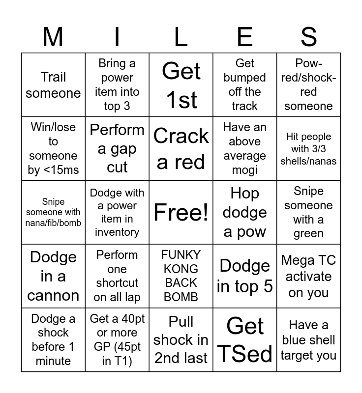 This bingo card has a free space and 24 words: Perform one shortcut on all lap, Get a 40pt or more GP (45pt in T1), Crack a red, Dodge a shock before 1 minute, Pow-red/shock-red someone, Trail someone, Win/lose to someone by <15ms, Bring a power item into top 3, Hop dodge a pow, FUNKY KONG BACK BOMB, Have an above average mogi, Snipe someone with nana/fib/bomb, Dodge in top 5, Mega TC activate on you, Perform a gap cut, Get TSed, Snipe someone with a green, Get 1st, Hit people with 3/3 shells/nanas, Dodge with a power item in inventory, Have a blue shell target you, Dodge in a cannon, Get bumped off the track and Pull shock in 2nd last.