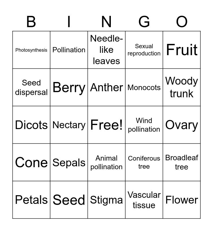 This bingo card has a free space and 25 words: Sepals, Stigma, Anther, Petals, Fruit, Photosynthesis, Seed dispersal, Pollination, Wind pollination, Animal pollination, Monocots, Dicots, Coniferous tree, Broadleaf tree, Berry, Tomato, Ovary, Needle-like leaves, Woody trunk, Nectary, Flower, Seed, Cone, Sexual reproduction and Vascular tissue.