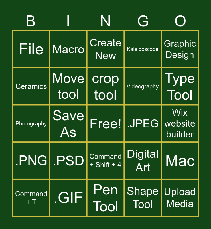 This bingo card has a free space and 29 words: Command + T, Command + Z, Save As, Place Embedded, File, Create New, Move tool, .PSD, .JPEG, .GIF, Wix website builder, Upload Media, Pen Tool, Shape Tool, Type Tool, Clone Stamp Tool, Command + Shift + 4, .PNG, Graphic Design, Photography, Digital Art, Animations, Videography, Ceramics, Kaleidoscope, Macro, Mac, crop tool and layer mask.