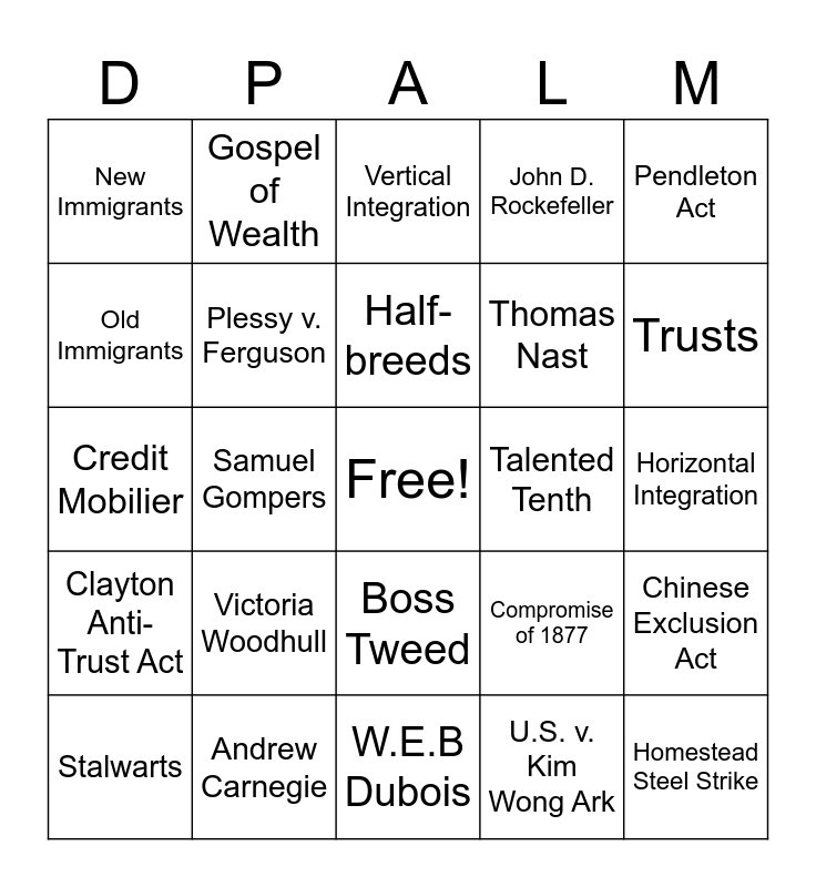 This bingo card has a free space and 24 words: Victoria Woodhull, Andrew Carnegie, Half-breeds, Stalwarts, Pendleton Act, New Immigrants, Old Immigrants, Gospel of Wealth, Talented Tenth, Boss Tweed, Thomas Nast, Credit Mobilier, Compromise of 1877, Chinese Exclusion Act, Plessy v. Ferguson, U.S. v. Kim Wong Ark, Horizontal Integration, Vertical Integration, Trusts, Samuel Gompers, Homestead Steel Strike, Clayton Anti-Trust Act, John D. Rockefeller and W.E.B Dubois.