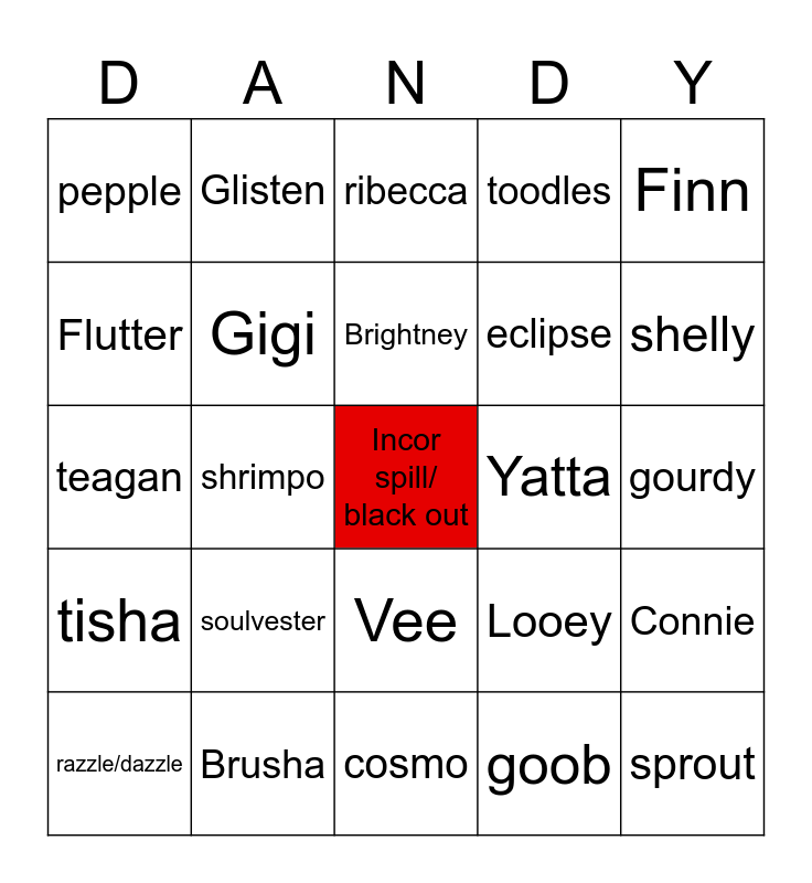 This bingo card has a free space and 24 words: soulvester, Brusha, Brightney, razzle/dazzle, Finn, pepple, Flutter, Glisten, Yatta, Vee, eclipse, teagan, Looey, Connie, Gigi, goob, gourdy, ribecca, shelly, shrimpo, sprout, tisha, toodles and cosmo.