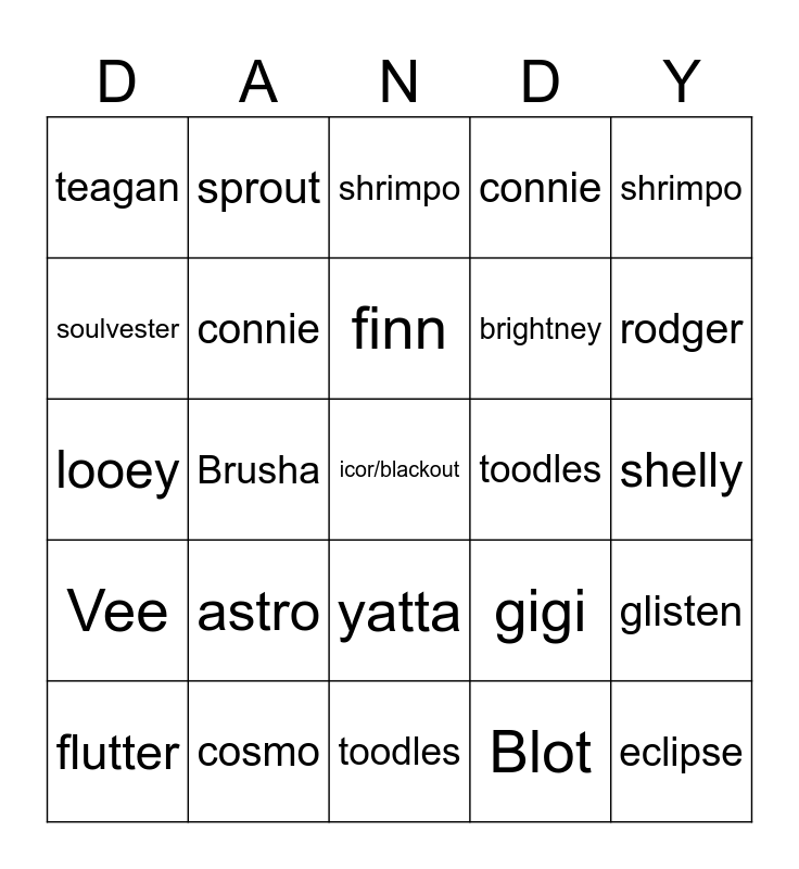 This bingo card has a free space and 24 words: astro, cosmo, finn, flutter, shrimpo, teagan, soulvester, sprout, toodles, yatta, brightney, looey, gigi, glisten, connie, Blot, shelly, shrimpo, rodger, Brusha, eclipse, Vee, connie and toodles.