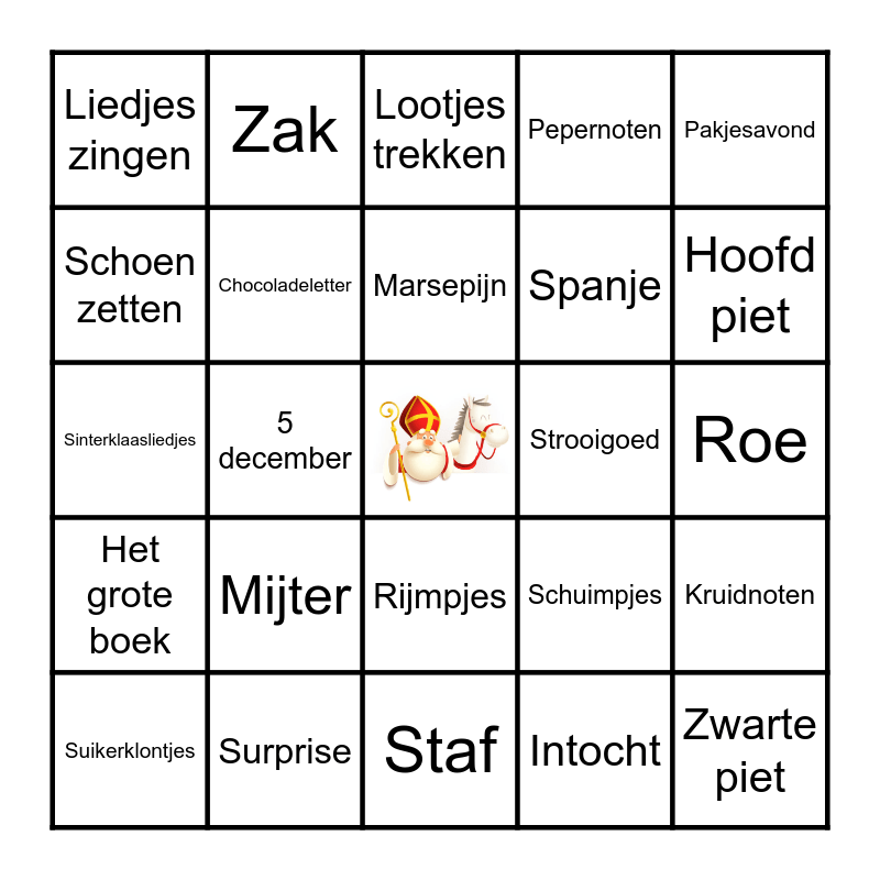 This bingo card has a free space and 48 words: Sint, Zwarte piet, Stoomboot, Staf, Mijter, Tabbert, Zak, Ozosnel, Schoen zetten, Kadotjes, Chocoladeletter, Pepernoten, Kruidnoten, Schuimpjes, Taai Taai, Speculaas, Marsepijn, Strooigoed, Chocoladecenten, Pakjesavond, 5 december, Intocht, Liedjes zingen, Spanje, Wortel, Hoofd piet, Suikerklontjes, Schoorsteen, Rijmpjes, Het grote boek, Pakjes, Banketletter, Roetveeg piet, Chocolade melk, Surprise, Paard, Strooien, Roe, Speelgoed, Banketstaaf, Inpakpapier, Verlanglijstje, Lootjes trekken, Suikergoed, Sinterklaasliedjes, Dak, Pietenmuts and Lekkers.