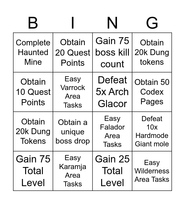 This bingo card has 16 words: Easy Karamja Area Tasks, Defeat 10x Hardmode Giant mole, Gain 75 boss kill count, Complete Haunted Mine, Obtain 20k Dung Tokens, Obtain 20 Quest Points, Easy Falador Area Tasks, Gain 25 Total Level, Obtain 10 Quest Points, Easy Varrock Area Tasks, Gain 75 Total Level, Obtain 20k Dung tokens, Obtain a unique boss drop, Obtain 50 Codex Pages, Defeat 5x Arch Glacor and Easy Wilderness Area Tasks.