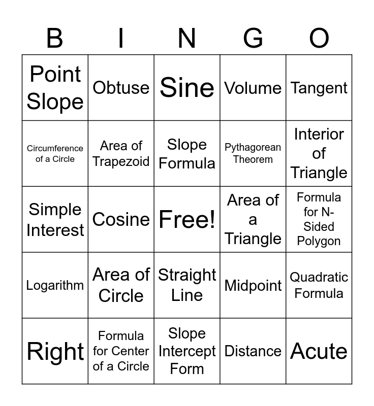 This bingo card has a free space and 24 words: Area of Circle, Formula for Center of a Circle, Slope Formula, Right, Tangent, Point Slope, Circumference of a Circle, Obtuse, Area of a Triangle, Straight Line, Pythagorean Theorem, Simple Interest, Midpoint, Quadratic Formula, Area of Trapezoid, Distance, Formula for N-Sided Polygon, Sine, Interior of Triangle, Cosine, Acute, Logarithm, Volume and Slope Intercept Form.