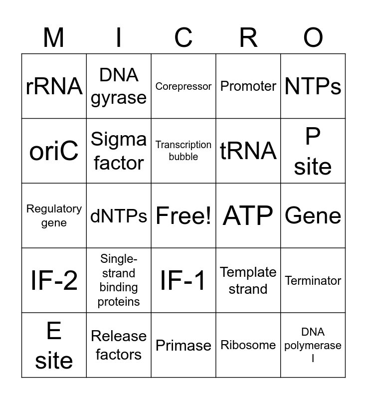 This bingo card has a free space and 47 words: DNA polymerase III, DNA polymerase I, Helicase, Primase, Single-strand binding proteins, DNA ligase, DNA gyrase, Okazaki fragments, oriC, RNA polymerase, Sigma factor, Promoter, Terminator, Template strand, Coding strand, mRNA, Transcription bubble, ATP, GTP, NTPs, dNTPs, Ribosome, rRNA, tRNA, A site, P site, E site, Peptidyl transferase, IF-1, IF-2, IF-3, f-Met tRNA, EF-Tu, EF-T, EF-G, Release factors, Gene, Operon, Operator, Repressor, Inducer, Corepressor, Regulatory gene, Constitutive gene, Polycistronic mRNA, Consensus sequence and Shine-Dalgarno sequence.
