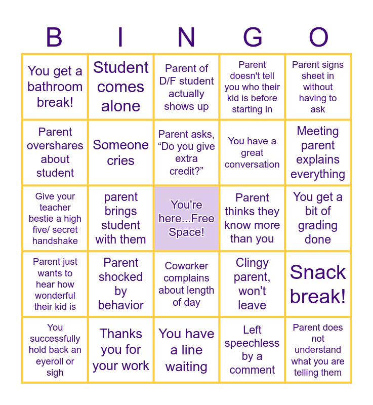 This bingo card has a free space and 24 words: Parent shocked by behavior, Thanks you for your work, Parent asks, “Do you give extra credit?”, You successfully hold back an eyeroll or sigh, Parent signs sheet in without having to ask, You get a bathroom break!, Parent overshares about student, Student comes alone, Parent thinks they know more than you, Coworker complains about length of day, You have a great conversation, Give your teacher bestie a high five/ secret handshake, Clingy parent, won't leave, Snack break!, Someone cries, Left speechless by a comment, You get a bit of grading done, Parent of D/F student actually shows up, Meeting parent explains everything, parent brings student with them, Parent does not understand what you are telling them, Parent just wants to hear how wonderful their kid is, Parent doesn't tell you who their kid is before starting in and You have a line waiting.