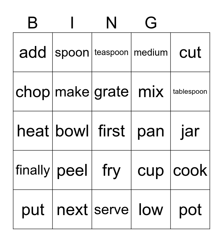 This bingo card has 25 words: peel, serve, grate, put, cut, add, chop, spoon, pan, fry, mix, heat, cup, cook, make, pot, jar, teaspoon, tablespoon, bowl, first, next, finally, medium and low.